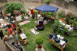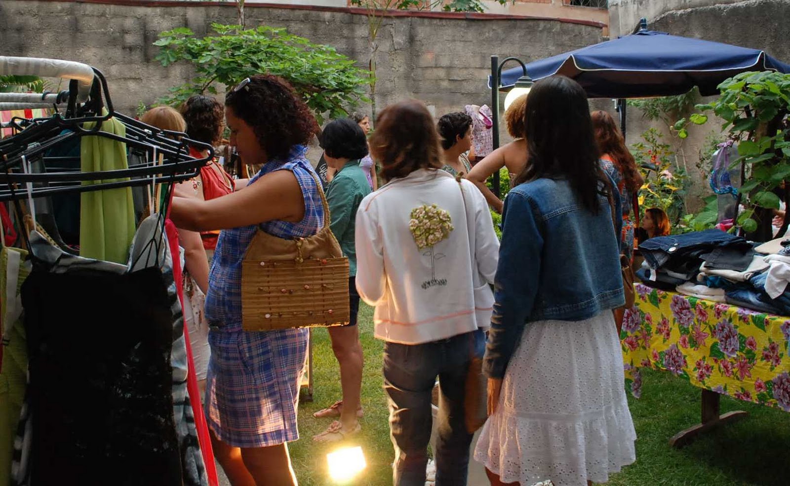 Pessoas alegres compartilhando ideias, sorrisos, opiniões, degustando um bolo com café, tomando um suco, recebendo dicas de maquiagem e, principalmente, achando roupas lindas a preços camaradas.